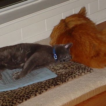 As he aged, he still remained very Royal, and was never a fan of being held. He preferred sitting on her or next to her, and laying on the pillow just above her head while she slept. Up until he was 15 he continued to race around the house with his toys. As he aged towards 19, the arthritis in his hips slowed him down and he preferred laying in the sunshine patches by the window, or on the heating pad with the dog.