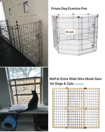 Cat Cafes work because they have airlock systems to ensure the cats don't get out as patrons come in and out. This is the same idea. I use the Frisco 42" (see picture; these come in many heights) because I have cats that are Olympic high jumpers! Create an enclosed area just inside the exterior door (see picture). These are very heavy so they don't tip over; you can also secure the sides to the wall with screws (the pen has a step through gate).